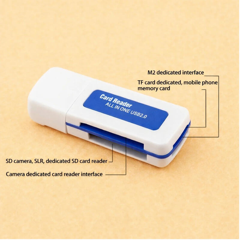 Supports SD, Micro SD (TF), Memory Stick, and M2 cards, 4-slot design for multiple memory card formats, USB 2.0 plug and play interface, Compact external card reader with no driver required.